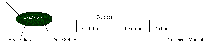 The academic category leads to many subsets. Could your title be sold to elementary schools? What about high schools, colleges, special-education or vocational schools? If you think it might sell to colleges, draw a line from the circle and write the word Colleges on it. Then think of all the places in which you could sell this title at colleges. For instance, most have their own bookstores and libraries. Could it be sold as a text or reference book? If it is sold as a textbook, is a teacher's manual required? Apply this thinking to each category until its map looks like this: ![]()
